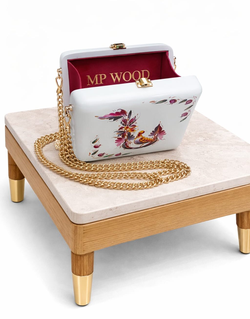 MP Wood բրենդի այս ձեռագործ,փայտե պայուսակը առանձնանում է ձեռքով նկարված նրբագեղ դետալներով և ոսկեգույն շղթայով։ Փայտի և գեղարվեստական մոտեցման համադրությունը արտացոլում է MP Wood-ի յուրահատուկ ոճն ու որակը։ Իդեալական է երեկոյան միջոցառումների և հատուկ առիթների համար։