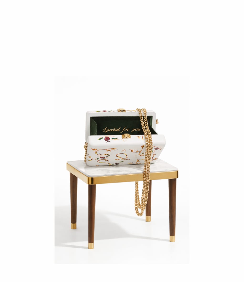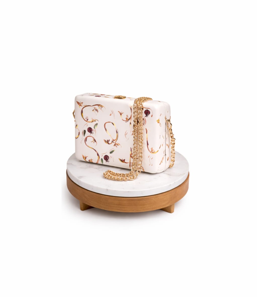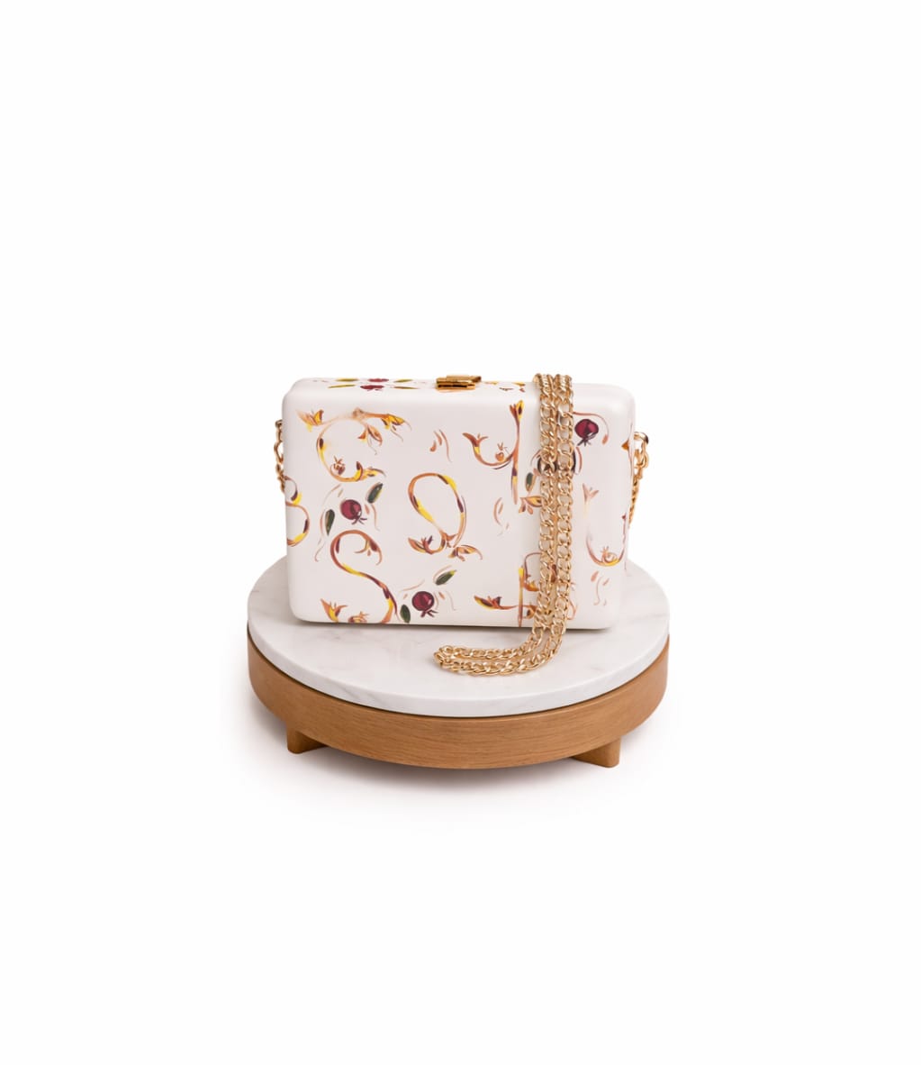 Այս ձեռագործ փայտե պայուսակը առանձնանում է նրբագեղ նռան նախշերով, որոնք ներդաշնակորեն միավորում են ավանդական մոտիվները և ժամանակակից ոճը։ Բաց գույնի հիմքը զարդարված է նուրբ ոսկեգույն և նռան տարրերով՝ ստեղծելով թեթև և էլեգանտ տեսք։ Ոսկեգույն շղթան շարժական է, ինչը թույլ է տալիս կրել պայուսակը թե՛ որպես կլատչ, թե՛ ուսին։ Ամուր փայտե կառուցվածքը ապահովում է դիմացկունություն, իսկ խնամքով մշակված ներքին հատվածը՝ հարմարավետություն և գործնականություն։ Գեղեցիկ ընտրություն է ինչպես հատուկ առիթների, այնպես էլ նրբաճաշակ առօրյա կերպարների համար։
