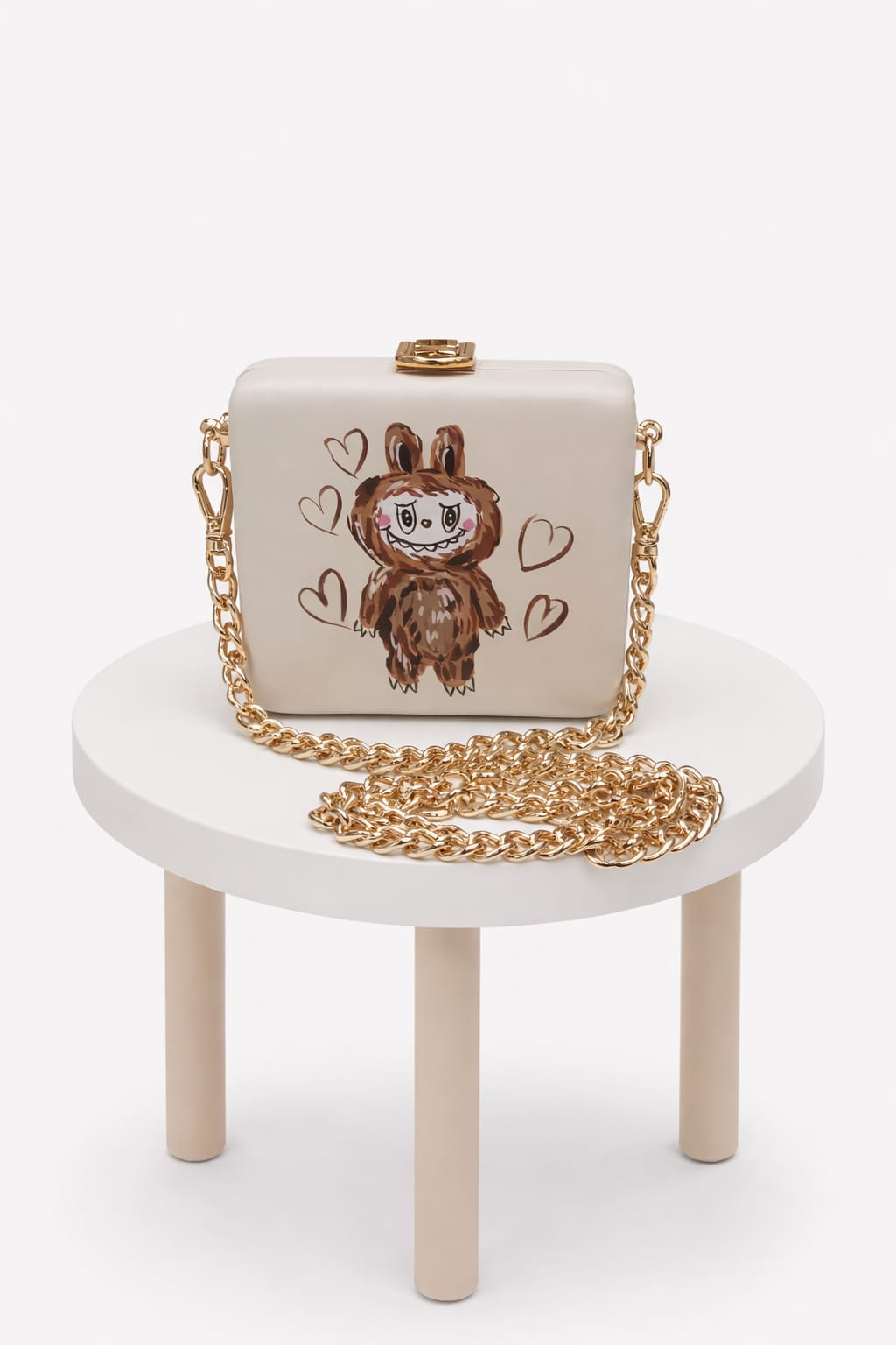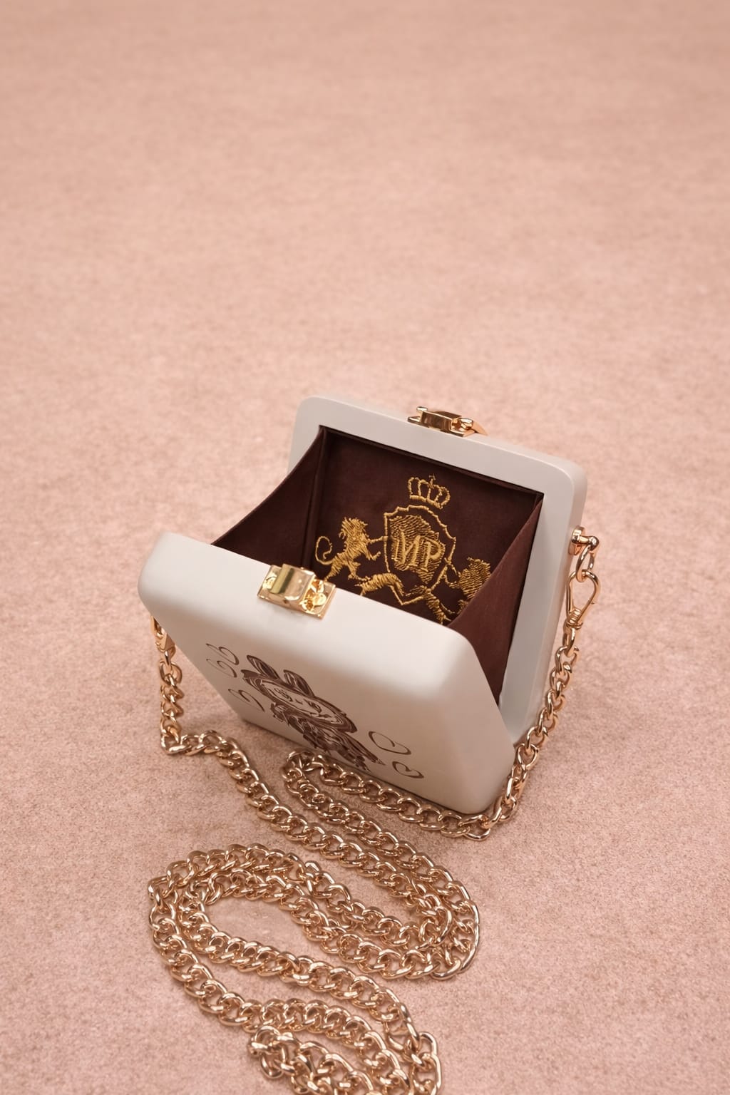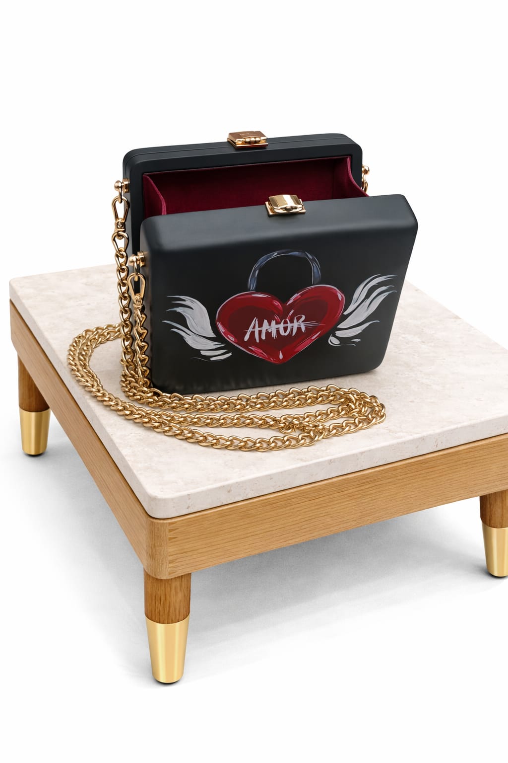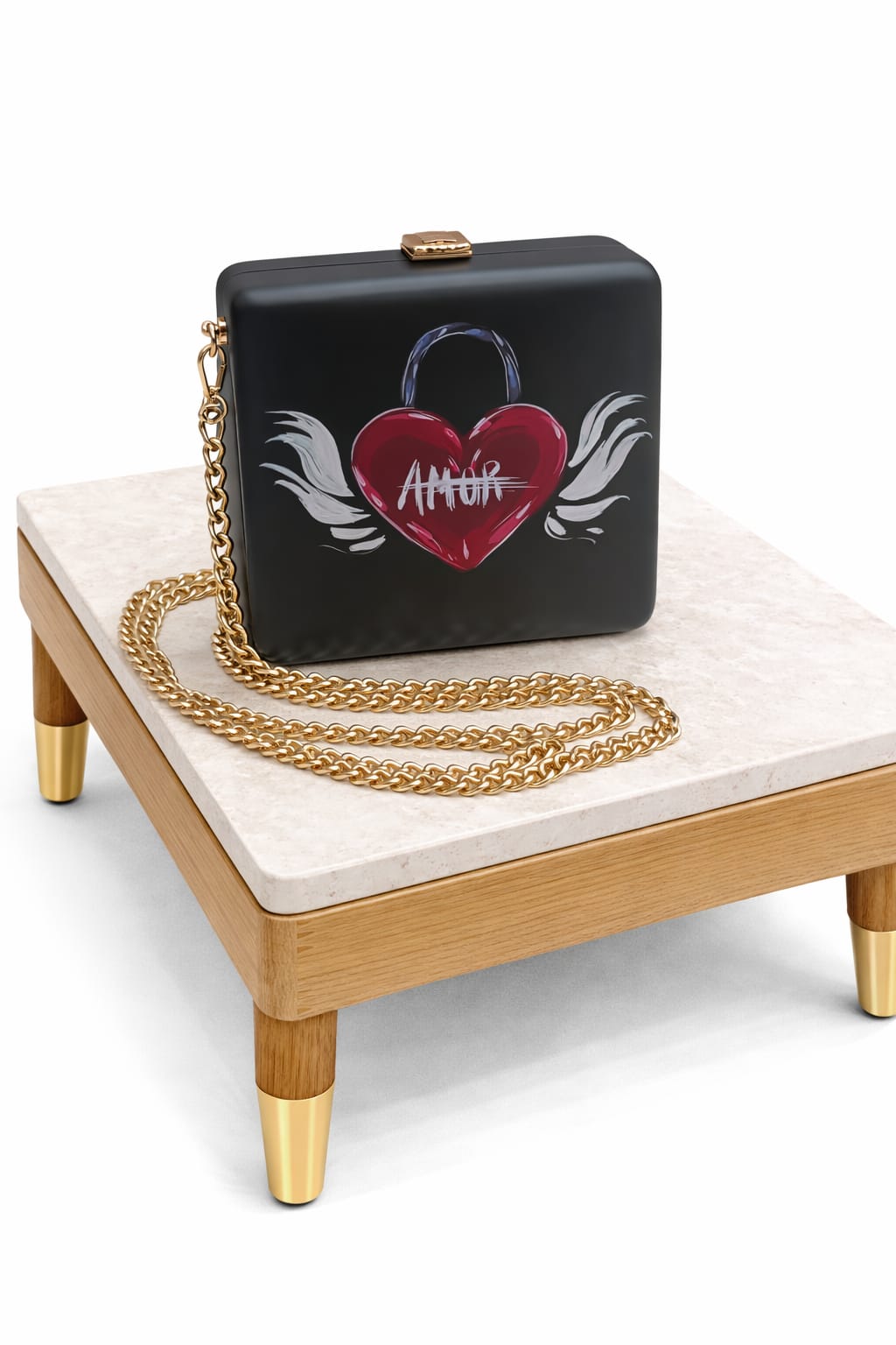 This black handbag by MP WooD is a statement piece designed for those who love bold details and emotional expression. The striking heart-and-wings artwork symbolizes strength, passion, and freedom, while the matte finish adds a modern, refined touch. Finished with a gold-tone chain and a secure clasp, it combines artistic character with practical elegance. Perfect for evenings, parties, and confident looks that stand out.