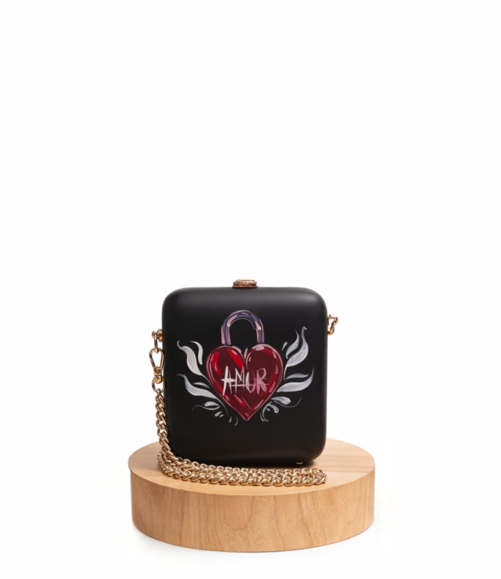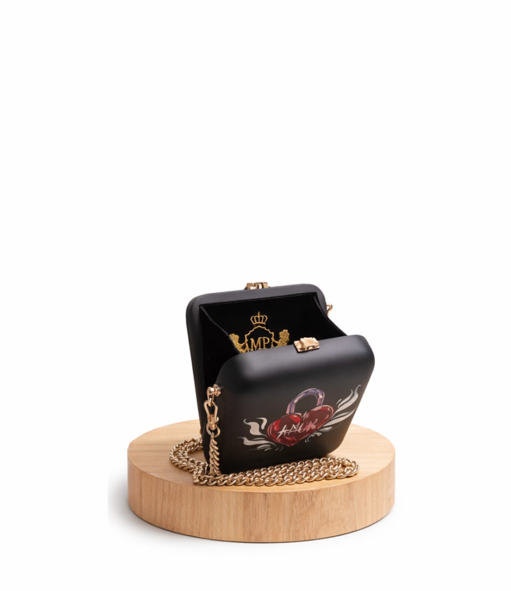 The AMOR Wooden Clutch by MP Wood is a statement accessory crafted entirely by hand. Made from high-quality natural wood and finished in elegant matte black, it features a striking red heart artwork symbolizing love and strength.