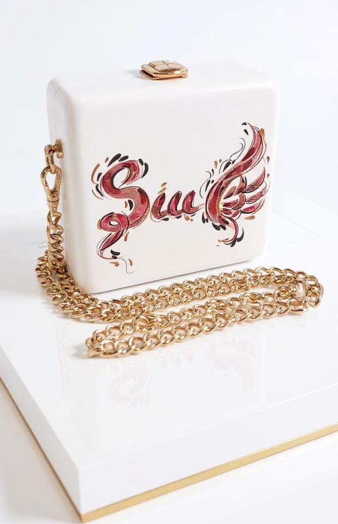 This exquisite mini bag by MP WooD blends elegance and artistry in a timeless silhouette. Crafted in a structured hard case with a smooth ivory finish, it features a graceful wing-inspired motif in soft rose and plum tones, creating a sense of lightness and sophistication.