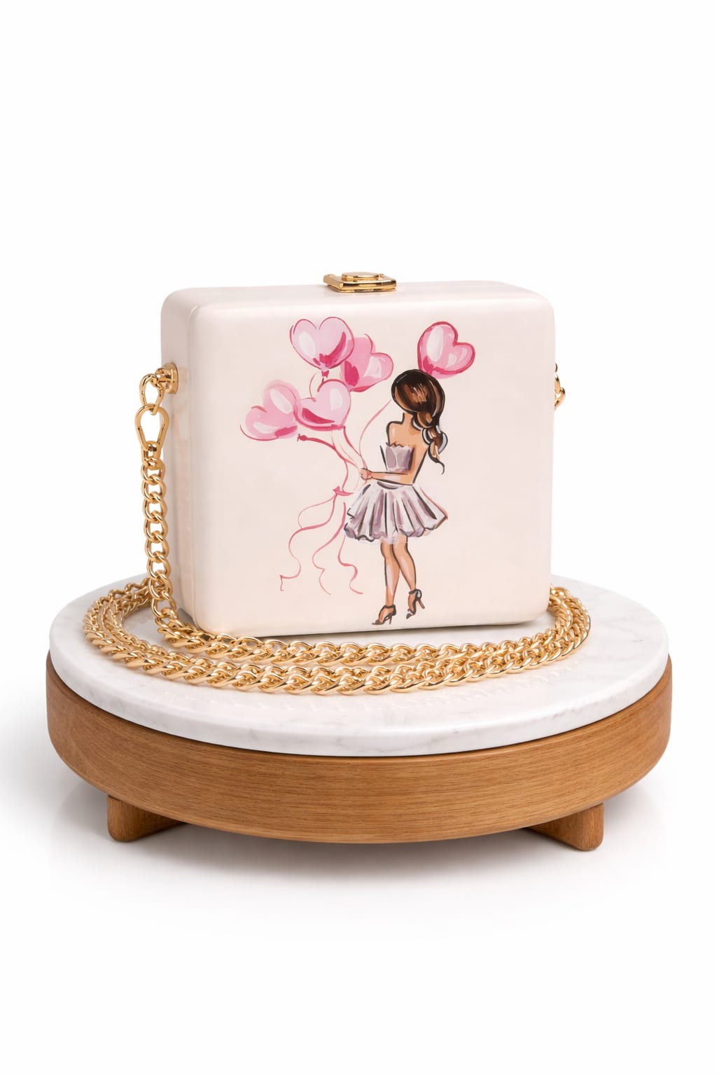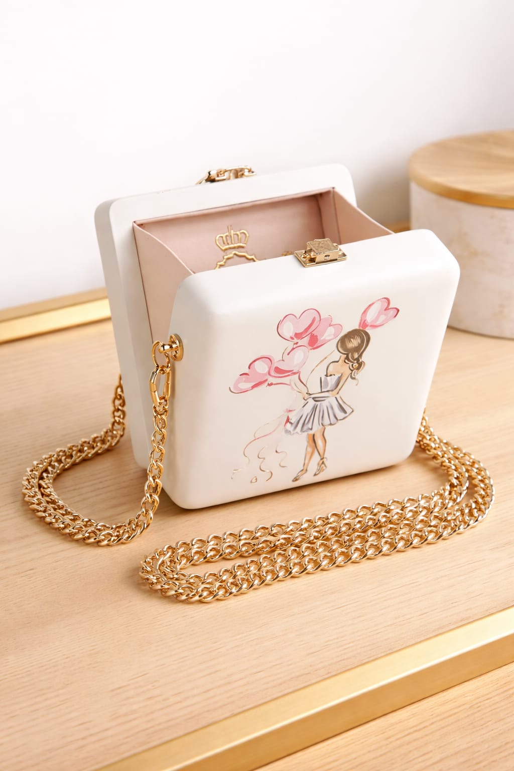 Эта мини-сумка сочетает в себе элегантность и креативность. Жёсткий корпус украшен нежной иллюстрацией девушки с воздушными сердцами, создающей романтичное настроение. Внутренняя отделка мягкая и аккуратная, подходит для хранения самых необходимых вещей. Золотая цепочка и замок придают сумке утончённый и праздничный вид. Идеальный аксессуар для вечеринок, мероприятий и особых выходов.