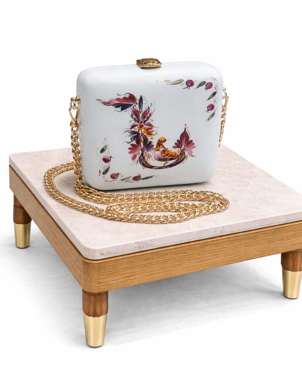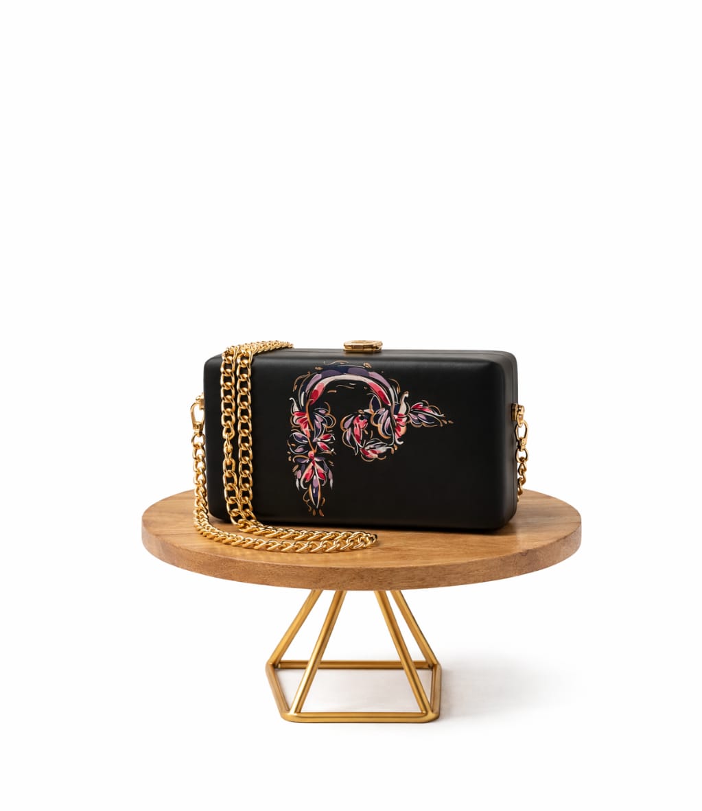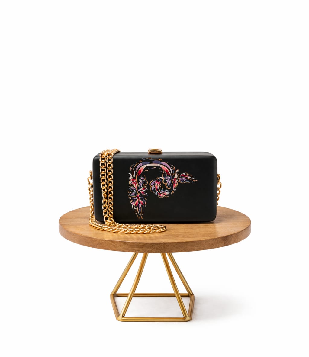 Стильный черный клатч с изящным цветочным узором “Т” в розовых, фиолетовых и красных тонах. Матовая поверхность и золотая цепочка с застежкой придают аксессуару элегантность и функциональность. Идеально подходит для вечеринок, торжеств и особых мероприятий.